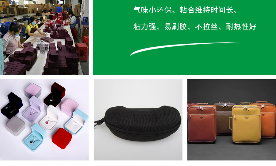 产品优点:粘性保持时间适中、环保、初粘力强、好操作、易刷胶、抗拉丝。