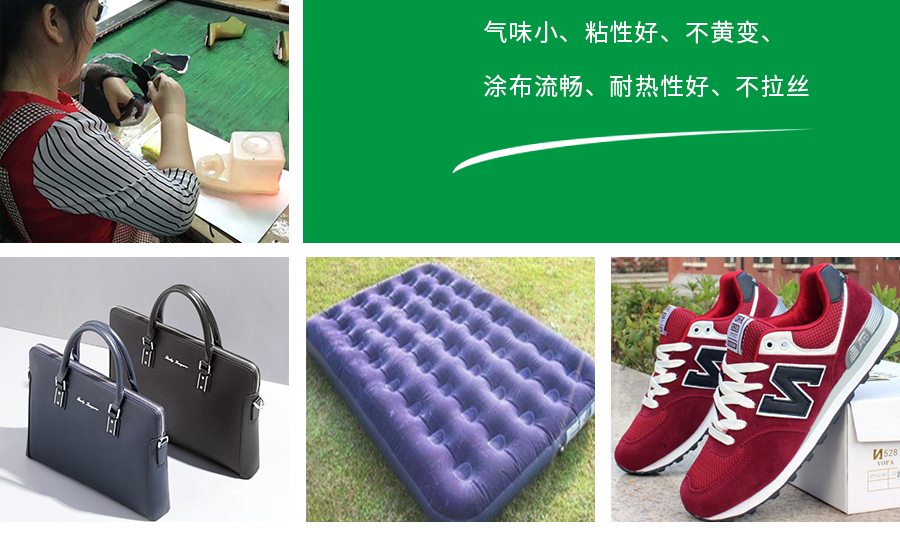 | 操作工艺: | a、胶水烘烤温度,一般为55-65℃,时间约2分钟。 b、胶水烘干后,请迅速对贴加压。 c、多孔性材质(如真皮、网布等),上两次胶效果更佳。 |
